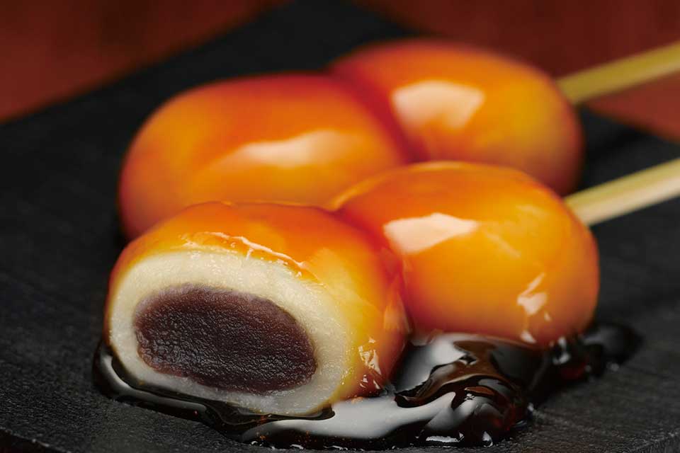 とろりとした濃厚な甘みの秘伝の蜜だれ団子全体を包み込み、一度に餡と蜜だれの絶妙なバランスが楽しめます。